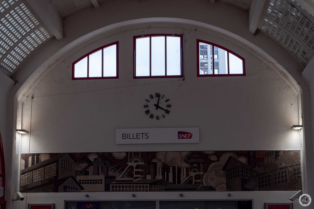 La gare a une forme de locomotive à vapeur. on peut assez facilement l’imaginer avec des grandes roues au niveau des portes et une cheminée représentée par la tour de l’horloge. Elle a été construite en 1927 par l’architecte Urbain Cassar dans le style art-déco. A l’intérieur, vous pourrez également découvrir des mosaïques d’Auguste Labouret évoquant le bassin minier.